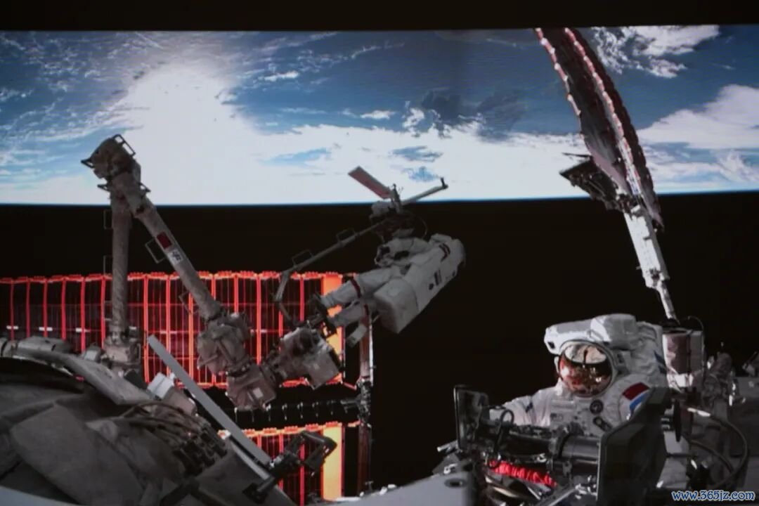 这是2025年12月9日在北京航天飞行控制中心屏幕上拍摄的神舟二十一号乘组航天员张陆与武飞(右)在舱外工作的画面。新华社记者 刘艺 摄