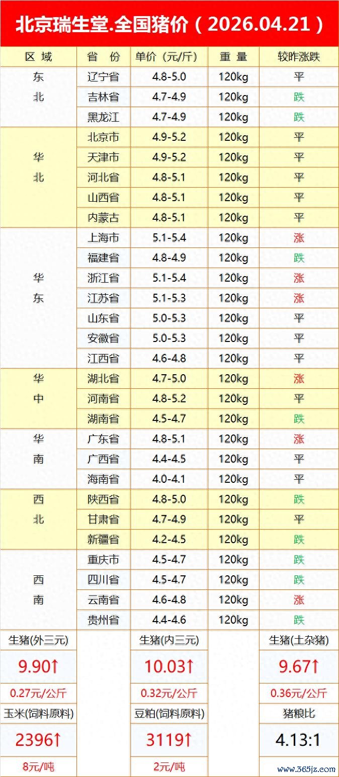以上分析基于2026年4月21日的市场行情数据,后续猪价走势还需持续关注供需变化、消费复苏以及饲料原料价格等多重因素的影响。